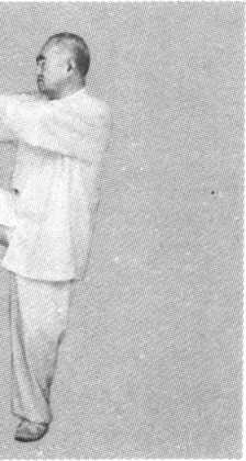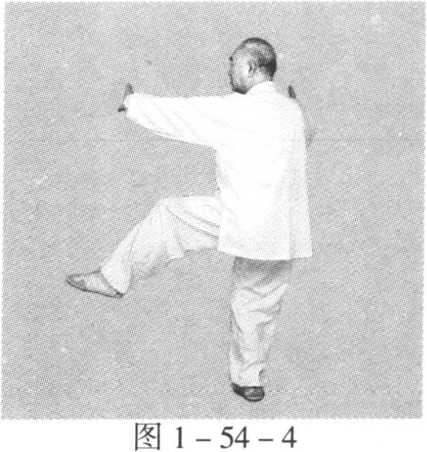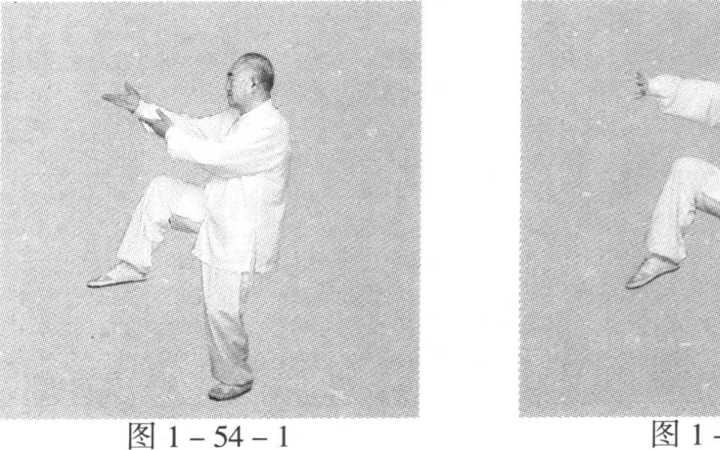 动作一:身体微左转升,胸向西,眼看双掌前。左脚逆缠膝里 扣,重心在左腿;右脚逆缠提膝里合,脚尖向里下护左膝。双掌顺 缠向前上领劲探起。左掌小指轻贴右肘弯里侧上,掌心向右;右 掌高与鼻同,掌心向上微偏左。(图1 -54-1)
