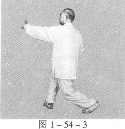 脚逆缠里踞转,形成拗步;右脚顺缠向前迈大步,落地外摆转踏 实,重心偏右前。左掌逆缠向左前上掘出,掌高与眼同,掌心向 左前方;右掌顺缠捋至右胸前,小指贴右肋,掌心向里上。(图1 -54-3)