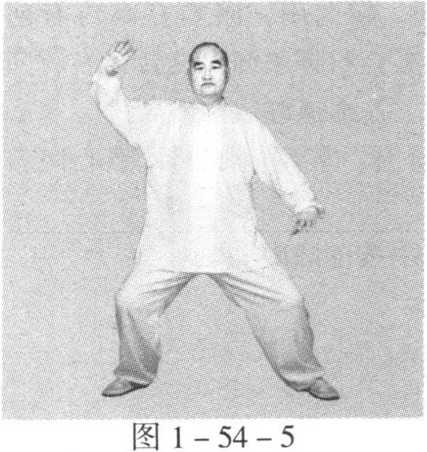 动作一:身体快速左转沉,胸向东南,眼看右肘外。左脚逆缠 膝里扣,重心移左腿;右脚逆缠提右膝,脚尖上翘向右侧铲步。左 掌由左胯外顺缠划外弧,变逆缠经头前按在右肘上,掌心向右前; 右掌由右前上顺缠划下弧经胸前,探至前上方,掌高与鼻同,掌 心向上。(图1-55-1)