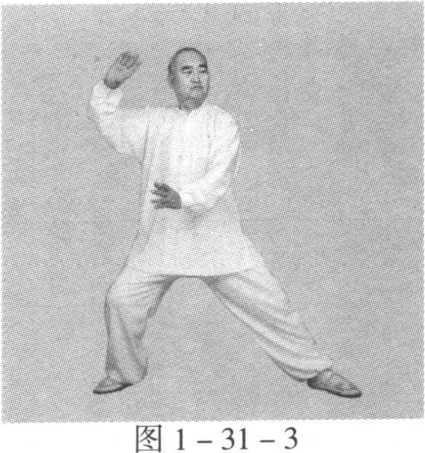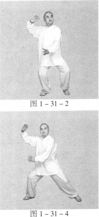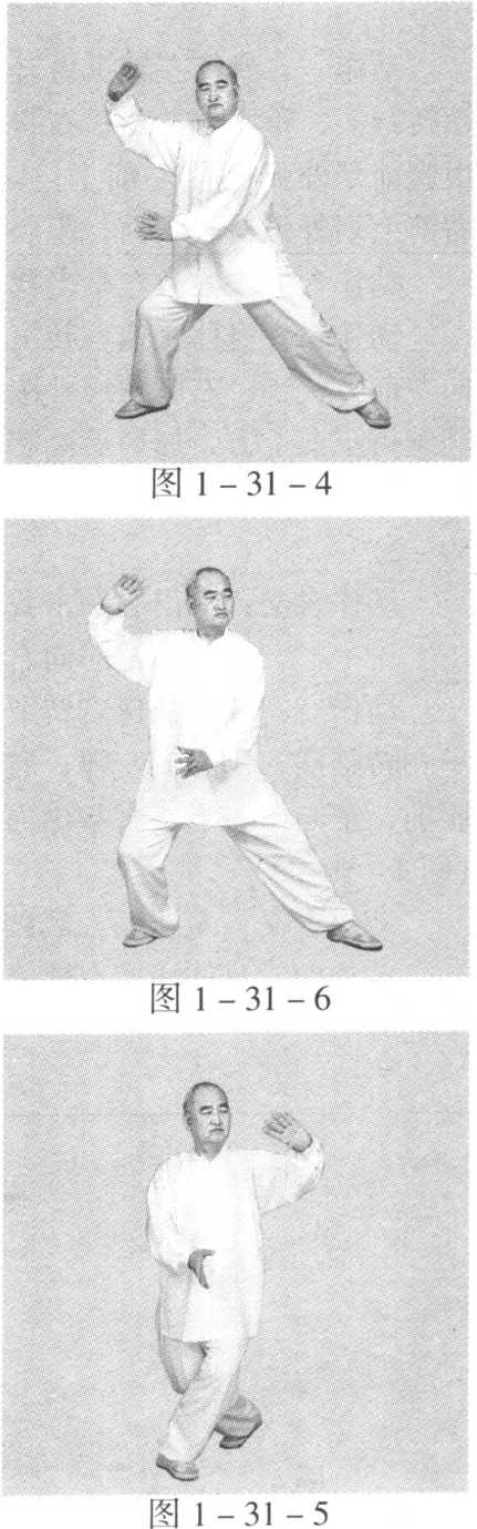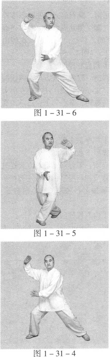 与第三十一势运手相同。(图1 -31-1)至(图1 - 31 - 6), 重用(0 1 -31 -4)至(图 1 -31 -6),再用(图 1-31-4)至 (图 1 -31-6)