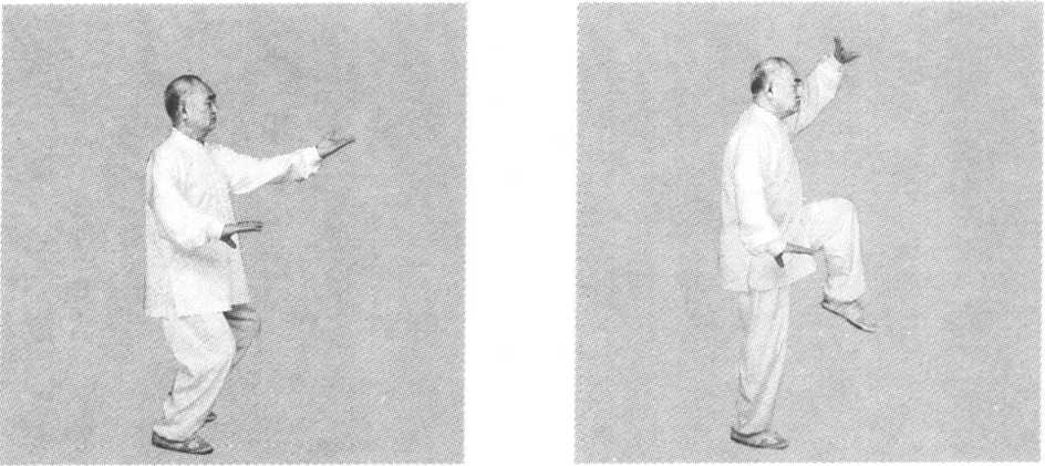 动作五:身体稍右转上升,胸向东,眼看左掌再看前下。左脚 逆缠里转,左膝上提,左脚下垂护右膝;右脚逆缠膝里扣,重心在 右腿。左掌由胸前逆缠旋转向左上稍前探,掌高过头顶,掌心向 上,指尖向右;右掌逆缠按至右胯外,掌心向下。(图1 -61-8)