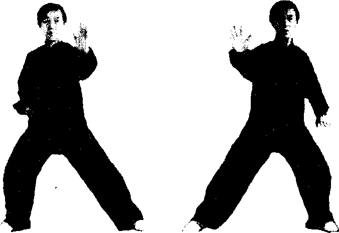 动作一:两腿成右弓步,左手置于胸前与肩 平;右手合于右腰间,目视前方(图2-47)。动作二:接上势,身体微左转,重心移至左 腿;同时左手逆缠下掘至腰间,右手先逆缠后振 变顺缠上翻至身体右前方,目视前方(图2-48)o 这样循环往返,反复练习,以身领手,以腰催肩, 以肩催肘,再达手,练习周身结合的后振劲。注 意:在后搬转折上翻时,切勿挑肩。图 2-47 图 2-48