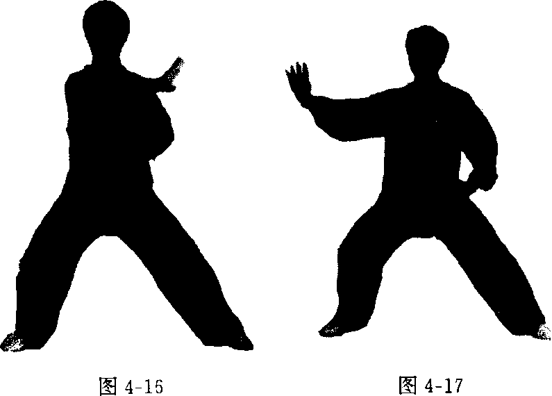 要求:下搬时,重心下沉,塌腰,两手合劲不 丢,加夕卜搠劲。此动呼气。
