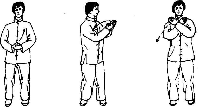 上动不停,身体重心向右移,上体微右转,同 时右拳变掌,两前臂内旋,两掌外翻,掌心均向外, 两腕相搭于胸前,右腕在里;目视左手(图303)。