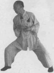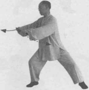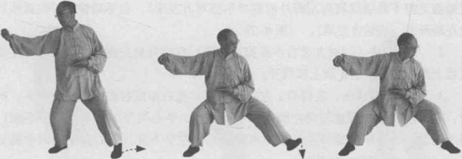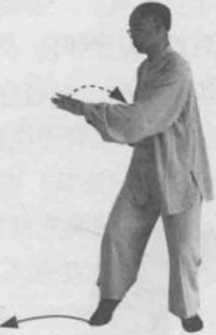 2 左转出右脚成右侧马步。同时,左手顺缠走里弧线转向胸部右侧变逆缠右手顺缠走外左小弧线向右胸侧变逆缠。(图8-11)