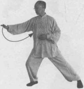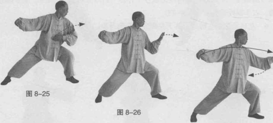 7 左肘法。左转身。左腿弓膝塌劲变左弓步。同时左手逆缠,左肘向左侧转出右手原处逆缠。(图8-25)