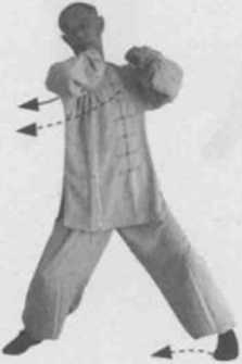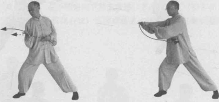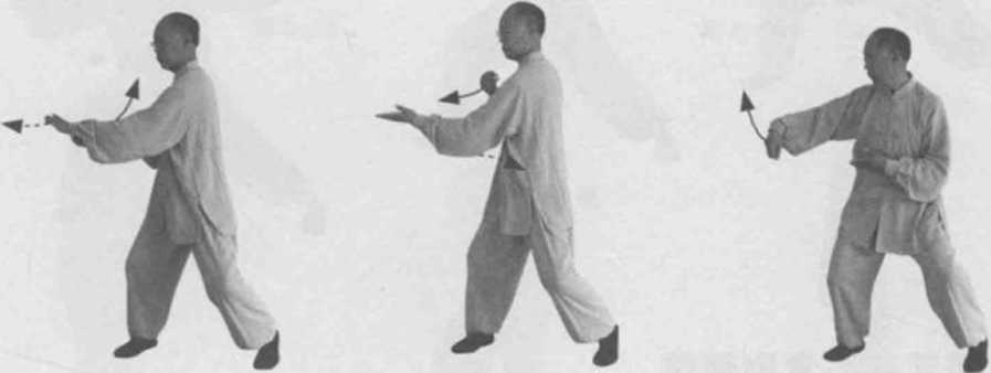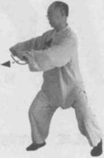 3 左引右挤法。左转身。同时,左手顺缠收至胸口右手仍为勾手逆缠走前左弧线(用手背挤对方肋部)。(图8-21)