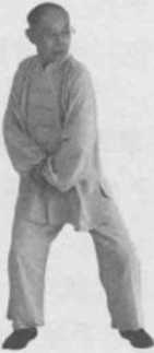 1 左背侧靠法。(对方在我左侧推我左臂)右转身左滑进步成左侧马步。同时,左手顺缠走里右前弧线转向胸前右手正旋上弧线开。(图8-142)