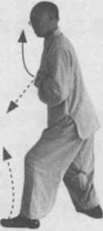 4 左转提搠法。左转身成左前虚步。同时双拳逆缠贴身上提至胸部。(图8-145)