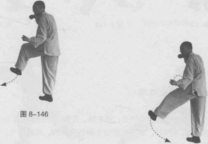 6 左脚蹬。仍右独立步略右转身左脚左下蹬同时,双拳原处顺缠。(图8-147)
