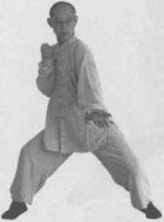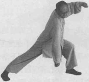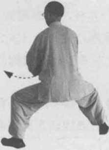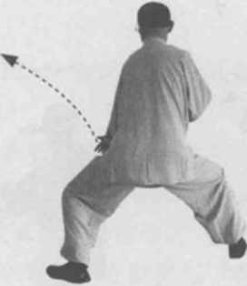 2 右转身。同时左手逆缠走左前下弧线转向裆部左前下方变顺缠右手由逆缠变顺走右上弧线转向右肩前侧并握拳。(图8-152图8-152附图)