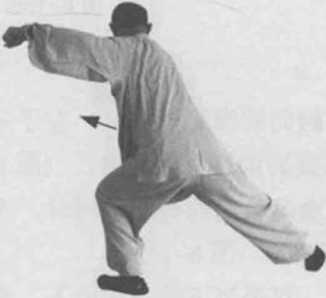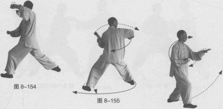 1 右后搠法。(对方在我右后侧推我右肩)左转身眼转看右侧同时右拳顺缠走里左前弧线右肩向左下方倾斜左拳原处逆缠。(图8-154)
