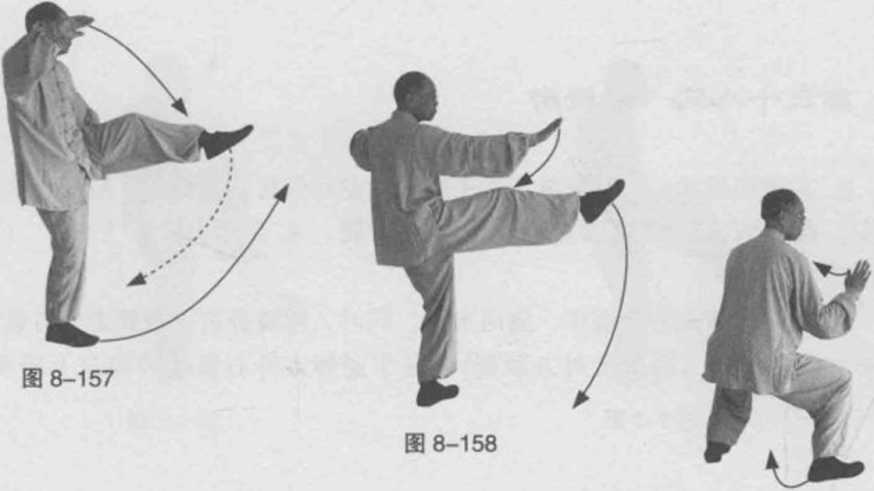 5 右弹踢。左转身左脚下落右脚蹬地起跳向前弹踢。同时,左手仍在左胯左外侧右手在右脚向前弹踢时拍击右脚面。(图8-158)