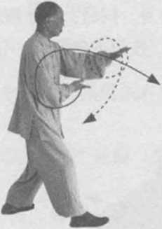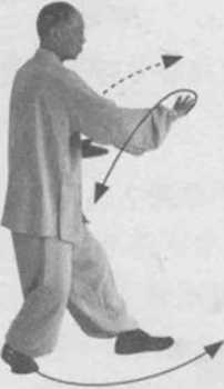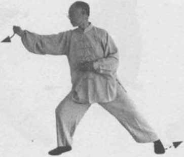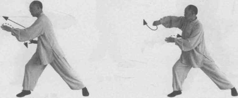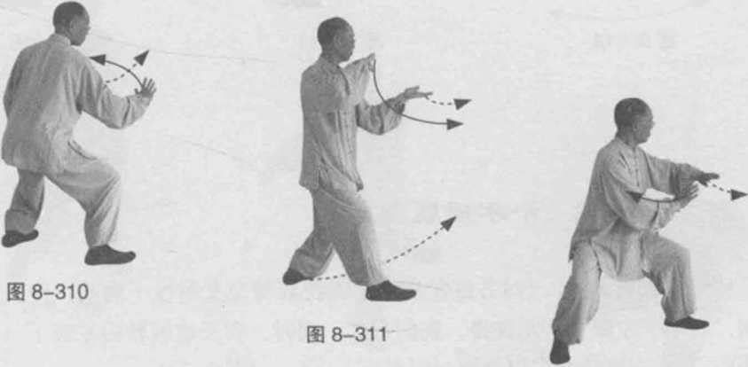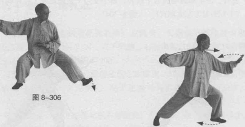 第5、6、1、8动与第四式单鞭6、7、8、9动相同第5-7动可参见图8-24图8-25、图8-28,第8动见下图。(图8-307)
