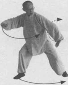 5 右转身右脚绷脚面走外右弧线(右脚面击对方背部)转向右前斜角。同时左手逆缠走外左上弧线擦右脚脚面转向左侧(挤对方颈部),右手逆缠走外右弧线转向右侧(引对方右手)。(图8-320)