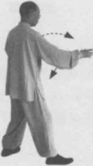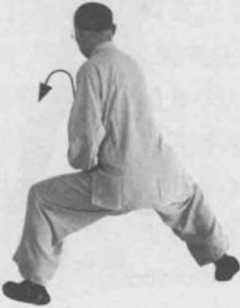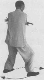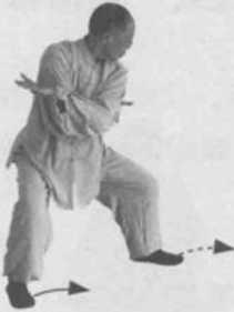 3 右转身左脚向左侧移半步右脚脚尖划地走外弧线成右后虚步右膝内扣脚尖点地。双手手型不变。(图8-318)