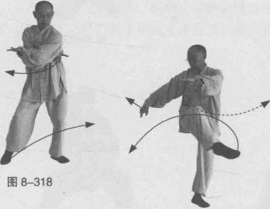 4 左转身右脚向左前提起成左独立步。同时右手逆缠(拿对方右手腕)转向右胯外侧。(图8-319)