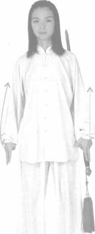 面朝南站立,两脚分开与肩同宽, 左手反手持剑,右手剑指,两臂垂立于 体侧。(1T)