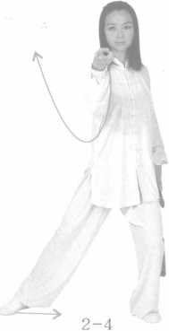右臂回到身右侧,继 续上行至右肩前,右脚内 收半步。(2-5)