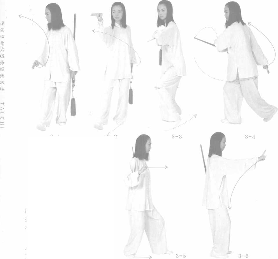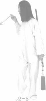 左脚向外平开半步, 双臂右前搠(2-1),在 身前画一个混元圈(2- 2, 2-3),左臂回到体左 侧,右手剑指划向身前, 指心朝内(2-4) 4