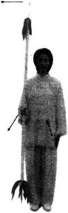 收势第二节八卦双头枪套路动作说明预备式身体直立,目视前方。脚跟并拢,双脚尖外展约45。。右手 握枪中部偏下,枪身竖直,枪尖离地面约2寸。右大臂自然下 垂,右小臂弯曲与大臂约成90。。左臂自然下垂,手尖向下,掌 心朝里,贴于左腿外侧。(图B1)图B1要点:气沉丹田,顶项垂肩,唇自然闭合,下颌微收,舌抵 上腭,自然呼吸,精神集中。起势上身向左扭转,右手将枪向前推出,同时左手回收至腰间, 掌心朝上,眼睛平视左方。(图B2)图B2