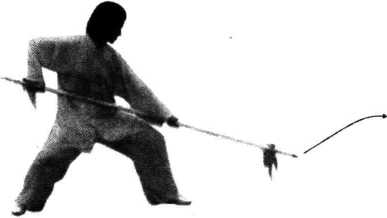 4 .重心前移,左腿屈膝成弓步,右手用力将枪挑扎出去,