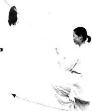 重心后移,左腿屈膝提脚,脚尖朝下,左脚掌紧贴右腿前 面。同时右手向后拉动枪杆,左手滑杆。左臂外旋屈肘,将枪杆 抱起。精神集中,目视枪尖方向(图33)。要点:动作一致,抱枪有力。枪杆紧贴右肋。
