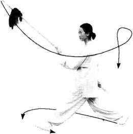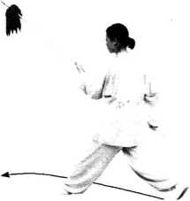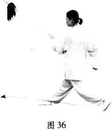 (1)左脚落步,左手向下压动枪杆,同时左臂外旋,手心 翻上。精神集中,向前平视(图35)。(2)上动不停。上体姿势不变。右脚向前迈步(八卦行桩 步)。精神集中,目视前方(图36)。(3)上动不停。上体姿势不变-左脚向前迈步(八卦行桩 步)。精神集中,目视枪尖方向(图37)。图37要点:落脚与压枪同时进行。行步时抬脚不宜过高,行似流 水,速度均匀。顺圈线行八卦行桩步,步数不限。行至起势的对 面位置。