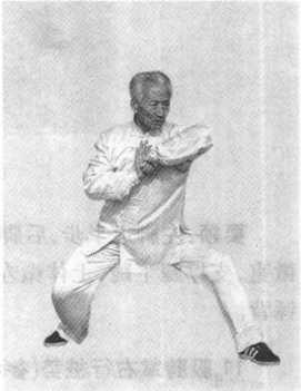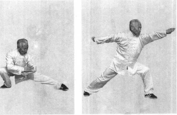 要领:左脚前落步,和右腿半蹲要同时一致;虎坐势前腿膝 胯接近水平,脚尖微里扣,后腿前跪,脚外摆;上体侧立要直,微 左倾斜,吸胯留臀沉肩,左上臂紧贴要平,力达肘尖。