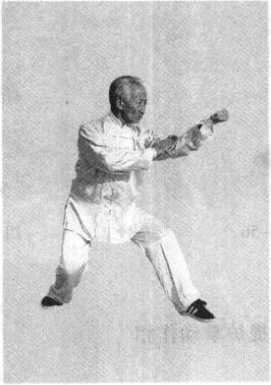 要领:左脚迈半步,后脚不动,前脚向前迈一竖脚距离;左膝 微直,支撑腿下跪,上体微左移动,左臂下弓形;速度要快,力达 锤背。