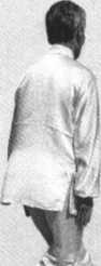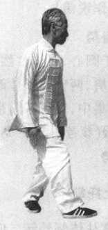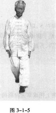 直肘展臂下沉于大腿外,成掌心向大腿的下竖掌(图3-1-5)。⑵ 两掌不动,右脚从左脚里侧经脚尖前外侧上步,落步脚尖里合; 左转上体(图3-1-6)。⑶右脚踩实站稳;左脚提起先收于右脚里 侧,再顺右脚向前迈步,落步脚尖向前;两腿形成剪子股势,两脚 交替向前行步,形成垂手掌左行转势;目平视圆心(图3-1-7)。