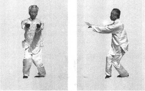 1.扣步右塌掌(1)(上接垂手掌左行转势)当左脚在前时,右脚经左脚里侧 迈步,在左脚尖前正扣步;体左转,两掌外转上托于体前,成掌尖 向前的仰掌与胸口平(图3-1-8)。⑵上体右转;两掌里旋,随右转 上体,推塌成掌尖向右的俯掌与肩平,目视两掌间(图3-1-9)。要领:⑴⑵动作连贯,扣步成丁字形,相距一脚宽;两腿屈 膝接近半蹲;上体右转90。;沉肩下弓臂,力达掌心。图 3-1-8图 3-1-8图 3-1-9图 3-1-9图 3-1-8图 3-1-8图 3-1-9图 3-1-9