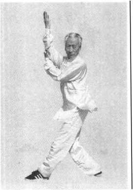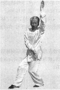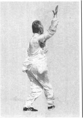 右脚站稳支撑,左脚经右脚内侧,弧形向体后摆步,身体随 之左转。右掌不动,左掌直肘顺右臂上穿,在右肘处成掌心贴肘 的竖掌(图3-l-34)o