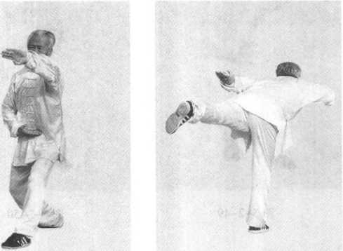 要领:左腿后蹬高不过头,低不过膝,腿挺直,与上体前俯 平,脚跟与肩平;支撑腿挺立站稳;左臂直,力达掌尖;右臂弓,力 达掌心。