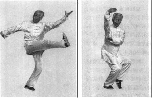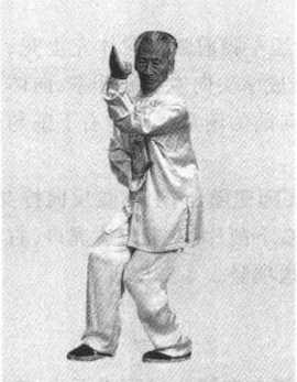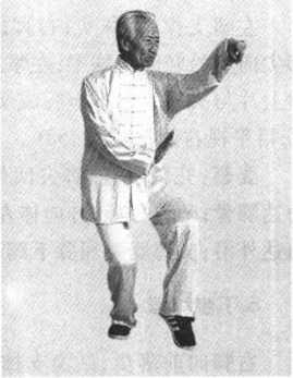 要领:丁步两腿膝胯接近水平;弹掌要微右拧身,向左摆胯, 以肩为轴,肘里合,用虎口侧向上弹,力达虎口侧。
