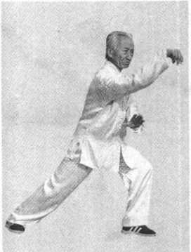 要领:扣步两大腿屈曲,上体要直,微左拧;掌翻转、肘里合要 同时,前臂和掌形成一条直线,左掌向左下倾斜,力达肘里侧。
