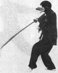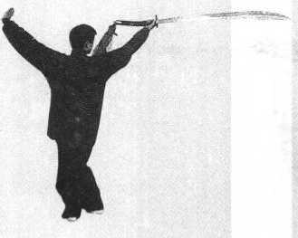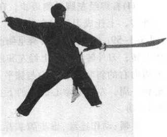 要领:两脚分前后,脚尖一致向前,腿略蹲;上体左拧,两臂 平直,力达刀尖。