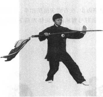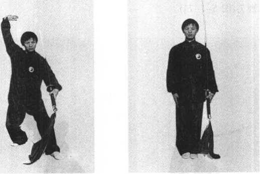 要领:上步脚尖向前,腿略弯;左手握于刀柄上,刀背贴于 左臂,刀刃向前;并步两脚齐,腿立直;目视前方。