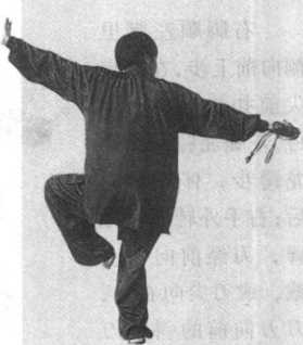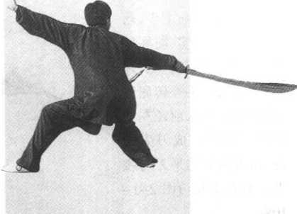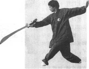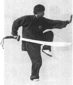 要领:提膝与腰平,小腿里摆,脚面绷平;支撑腿略屈,脚踩 实;上体略左倾,左臂直,右臂半弓,刀尖略低,力达刀刃。