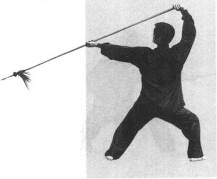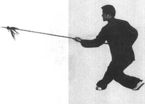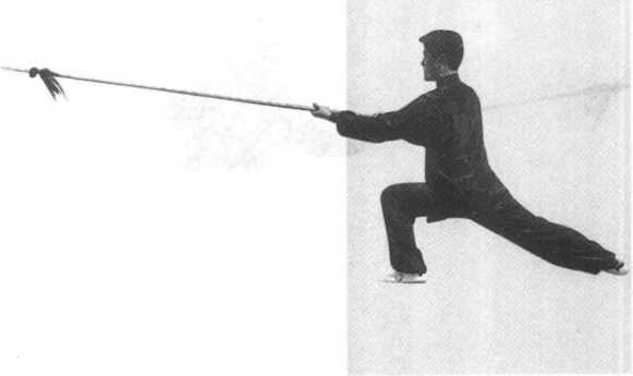 要领:叉步前脚尖外摆,腿直;左脚掌着地,小腿接近地面, 上体略左倾,两臂弓形,枪尖略上翘,力达枪尖侧。