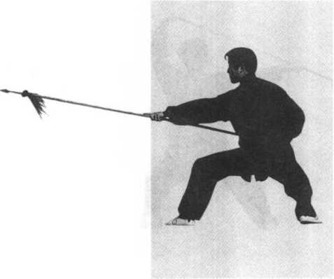 要领:弓步脚尖向前,大腿与膝胯平,后腿要直,脚尖外摆, 上体正直,两臂略弓,枪平,力达枪尖。