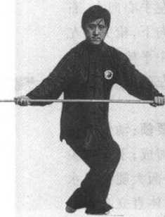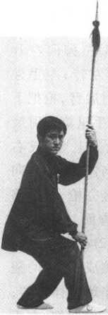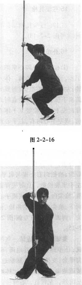 ⑴左脚在右脚心里侧 成丁步,右腿屈膝下蹲,体 右转;右手里旋松把,屈肘 弓臂前滑,枪把上竖;左手 外转屈肘弓臂,成枪尖向 右前下立,左手心向左, 右手心向右的下竖立枪, 枪尖低于膝(图2-2-16)。 ⑵左脚顺右脚尖向前上步, 左腿屈膝下蹲,体左转;两 手直肘展臂,枪向左立推 成左手心向后,右手心向 前的下竖立枪;枪尖低于 膝,目平视枪杆,两脚交替 行步转圈,即转枪左行转 势(图 2-2-17)0