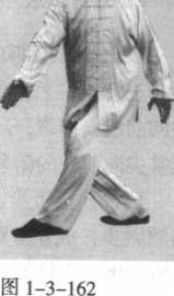 上接搭掌左行转势。当 左脚在前时,右脚经左脚内 侧迈步,在左脚尖前扣步, 左脚顺右脚后向右脚外倒步, 腿下蹲,右脚后退于左脚里 侧,丁步,含胸吸腹,全身 后退,胯后卸,头上扬;两 掌外旋;成掌尖向前的仰掌, 右掌与胸口平,左掌与肩平; 目视前方(图1-3-163 )o