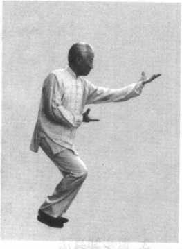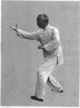 要领:横迈步、转体和推臂动作要一致。横上步的同时,前脚 略顺碾步,成左龙蹲势,前脚尖向前,腿略前弓,支撑脚尖外摆, 腿略下蹲,上体侧立要直。右臂接近直,五指略扣,虎口撑圆,力 达掌心,左臂左前弓,前臂与掌平直,距体一掌远,力达全掌。