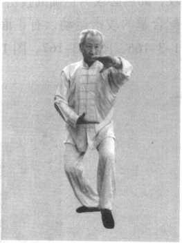 要领:步法动作要快,与转体协调一致,在原地转圈一周 后,仍回归为佳。虎坐势前脚尖略里扣,大腿水平,支撑脚尖外 摆,腿下蹲达最低,上体右侧拧,直立,吸胯。两掌随意而动。