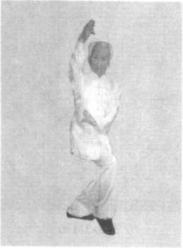 上接搭手左行转势。当左脚在前时,右脚在左脚尖前外扣 步,左脚向左掰步,右脚在左脚心内侧丁步,左转体下蹲势;右 掌外旋,屈腕直肘展臂,顺左前臂下向上弹,成掌尖向前上的立 掌,高于头;左掌屈肘弓臂下按于体前,成掌尖向右的俯掌,高 与胸口平;目视前上方(图1-3-180 )0
