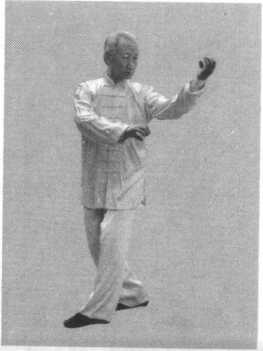 右脚向左脚前落步,体左转,右掌上抬,坐腕沉肩坠肘,成 掌心斜向前的竖掌,掌尖与眉平,左掌外旋屈肘弓臂向右下推于 右肘下,成掌尖对右肘尖的竖掌,两脚交替行步转圈形成措掌右 行转势,目视右掌尖。参看图1-3-12。