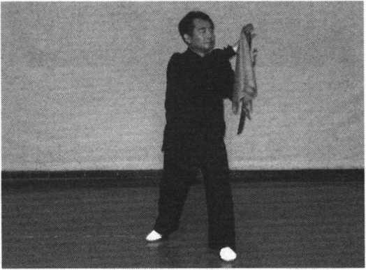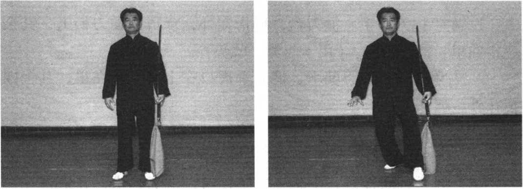 1 .面南站立,两脚分开,如肩宽。左手握刀,刀背贴靠臂上, 刀刃朝前,刀尖朝上,垂于左侧。右手五指自然放开,拇指朝前, 垂于右侧,眼向前平视。虚领顶劲,含胸拔背,松肩垂肘。 (见图1)