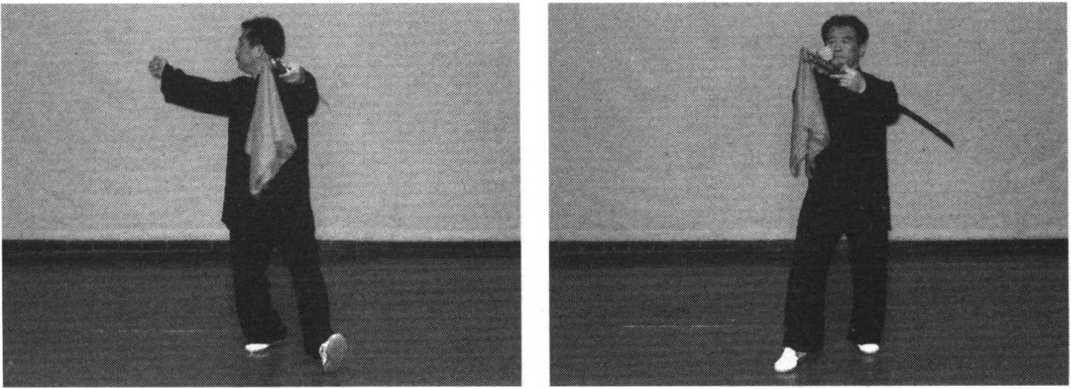 7.身向左转,左脚向前迈步弓腿(南),同时左手抱刀以刀柄 向上外翻,右掌随即按于刀柄上,刀刃向外,眼看刀柄。 (见图7 - 8)