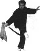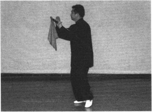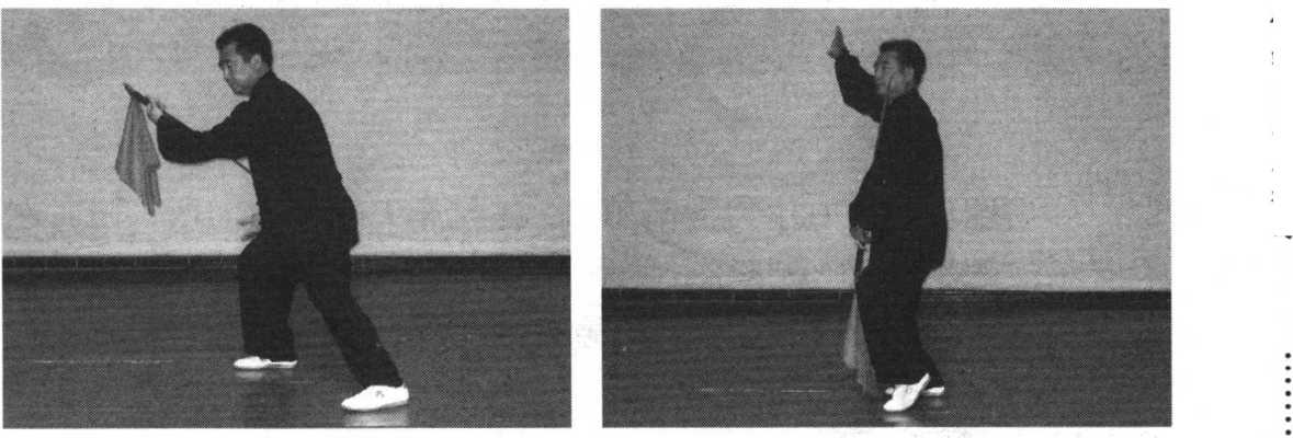 4.左腿前弓步,同时右拳经耳门向前落于刀柄上,虎口朝上. 右脚同时向前上一步落脚尖,眼看两手。(见图4)4.左腿前弓步,同时右拳经耳门向前落于刀柄上,虎口朝上. 右脚同时向前上一步落脚尖,眼看两手。(见图4)